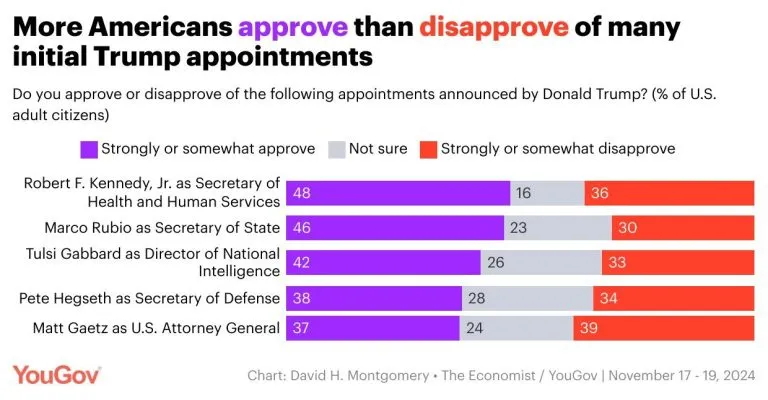The YouGov/CBS News poll paints a clear picture of public opinion on Trump’s second-term preparations: Americans are largely supportive of his transition efforts and Cabinet nominees. While some Democrats and media figures continue to push negative narratives, the survey reveals that Trump’s plans resonate with a broad swath of the population. With figures like Rubio, Kennedy, Gabbard, and Hegseth earning positive marks, the groundwork for a successful administration seems firmly in place.