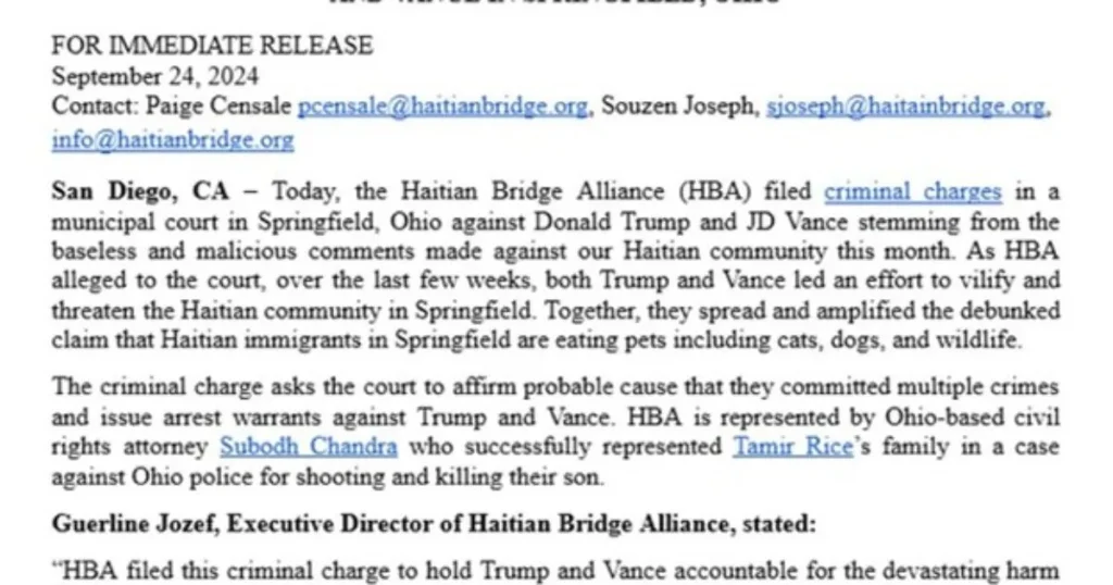 A press release from the Haitian Bridge Alliance condemned the remarks made by Trump and Vance, calling them “baseless and malicious.” Subodh Chandra, the lead attorney representing the nonprofit, issued a stark warning to the GOP candidates: “Trump and Vance are not above the law.” Chandra emphasized the need for accountability, stating, “The Haitian community is suffering in fear because of Trump and Vance’s relentless, irresponsible, false alarms, and public services have been disrupted.”