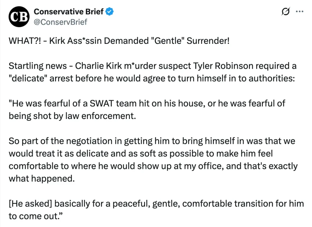 Authorities honored the request. Robinson surrendered without incident and is now facing serious charges connected to the assassination of Charlie Kirk.