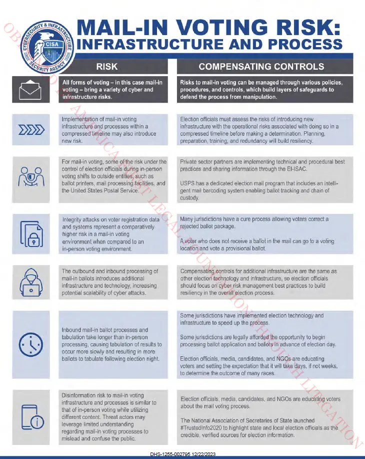 Mail-in ballot risks are acknowledged by CISA in its own documents.