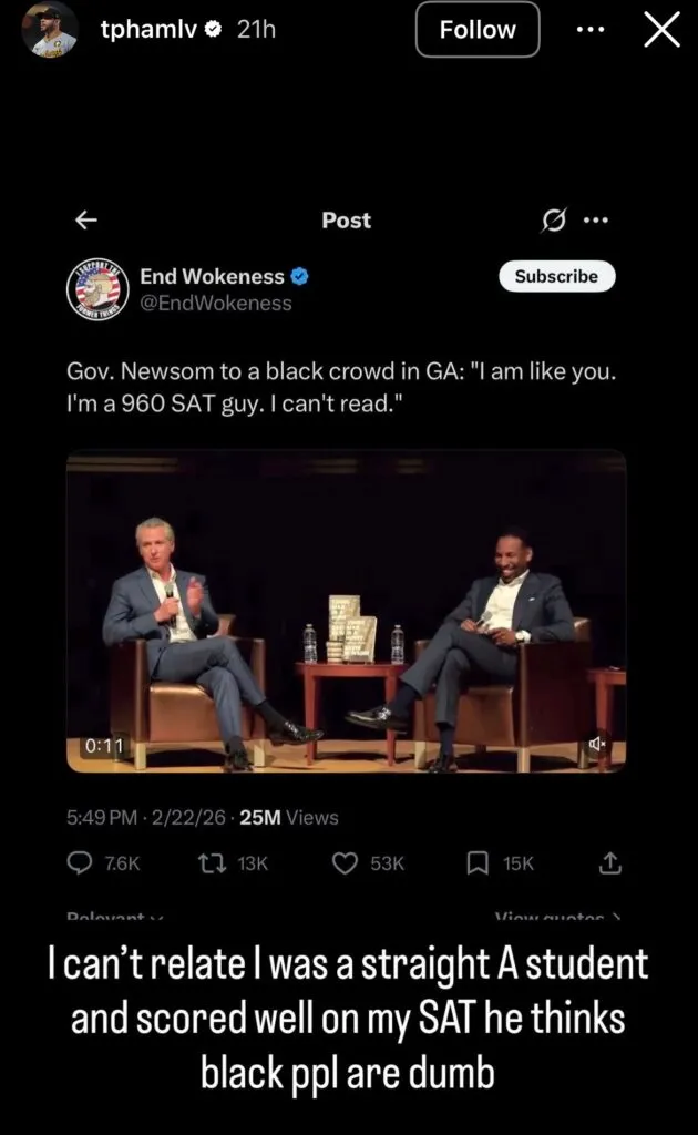 The baseball star followed up with another post highlighting Newsom’s apparent contradictions. In a separate clip, the governor boasted during a podcast that he read a 260-page book in just an hour and a half—raising questions about the consistency of his statements regarding literacy.
