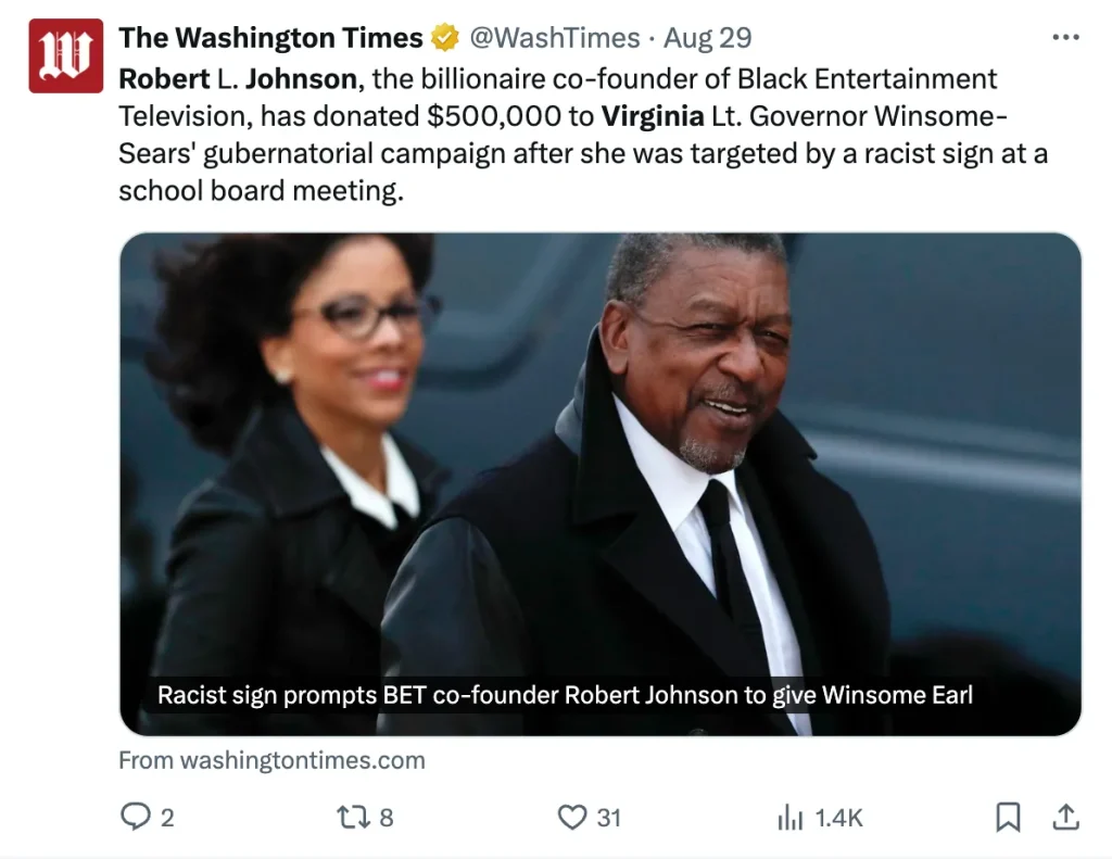 Johnson, who has previously supported Barack Obama and Hillary Clinton, explained his decision in a powerful letter to the lieutenant governor. “Madam Lt. Governor. I was so appalled by that racist diatribe displayed by a useful idiot at a recent press event that I chose to show all the voters of Virginia how Black Brothers stand up to defend and support their Black Sisters when confronted with unadulterated racism,” Johnson wrote. “I have always been a good investor and that’s why I’m investing in you.”