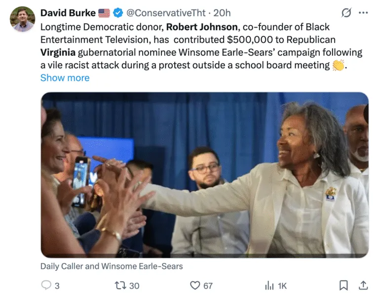 That dignified response caught the attention of Robert Johnson, co-founder of Black Entertainment Television (BET) and one of America’s most influential black businessmen. Johnson—who has long been a heavyweight donor for Democrats—shocked the political world by donating $500,000 to Earle-Sears’ campaign last month.