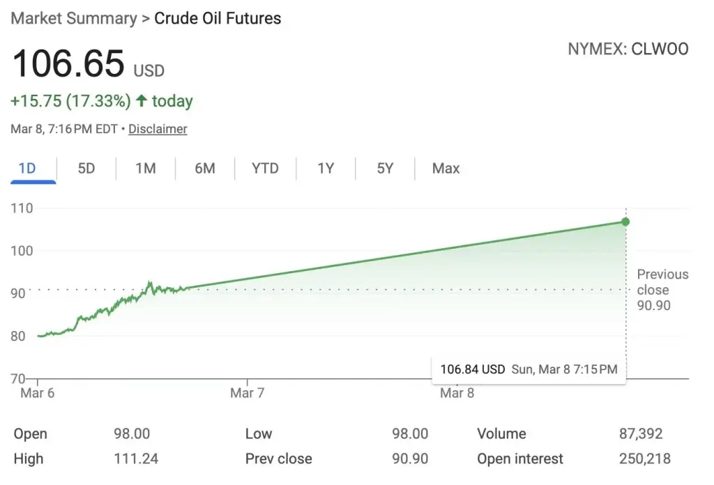 Energy traders quickly responded to the developments. West Texas Intermediate crude — the U.S. benchmark — soared by 16.2 percent, landing at $102.45 per barrel. Meanwhile Brent crude, widely used as the global pricing standard, climbed even higher, surging 15.8 percent to settle at $105.67.