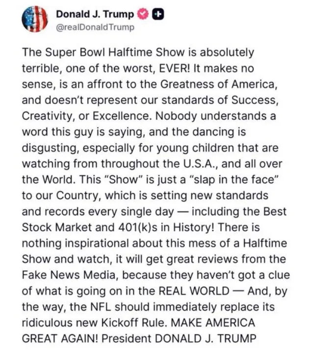 “The Super Bowl Halftime Show is absolutely terrible, one of the worst, EVER! It makes no sense, is an affront to the Greatness of America, and doesn’t represent our standards of Success, Creativity, or Excellence. Nobody understands a word this guy is saying, and the dancing is disgusting, especially for young children that are watching from throughout the U.S.A., and all over the World,” Trump wrote on Truth Social.