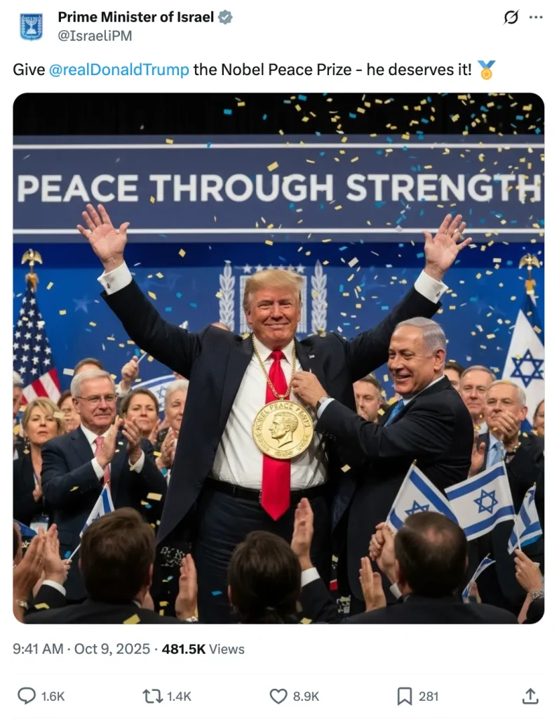 In a symbolic gesture that electrified Trump’s base, the office of Israeli Prime Minister Benjamin Netanyahu even posted a digitally altered image of Trump wearing the Nobel Peace Prize. The caption sent a clear message to the world. “Give @realDonaldTrump the Nobel Peace Prize – he deserves it!” the account wrote Thursday on X.