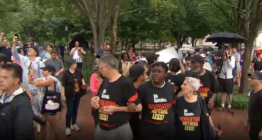 American flag burning by revolutionary Communist Party militants disrupts a Philadelphia Independence Day celebration.