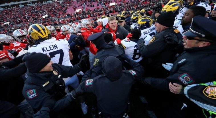 An already heated rivalry boiled over into chaos as Michigan and Ohio State faced off in a clash that ended with controversy and flying tempers. After Michigan secured a shocking 13-10 upset over the Buckeyes, the field turned into a battleground as tensions escalated near midfield. The Wolverines’ attempt to plant their flag on Ohio State’s logo ignited an all-out brawl, with players from both teams exchanging blows in front of stunned fans.